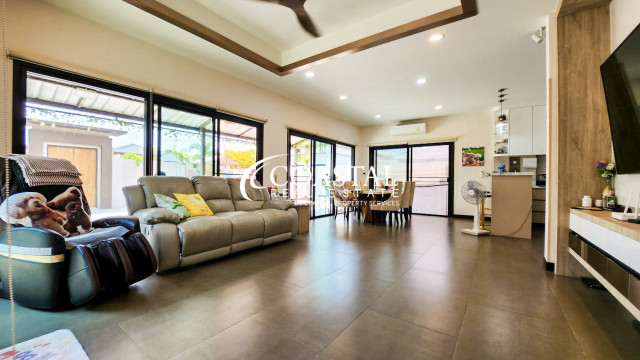 This single-story house for sale at Baan Pattaya 5 in Huay Yai offers a perfect combination of space, comfort, and modern living. The home features a living area of 270 square meters, thoughtfully designed to provide both functionality and style.